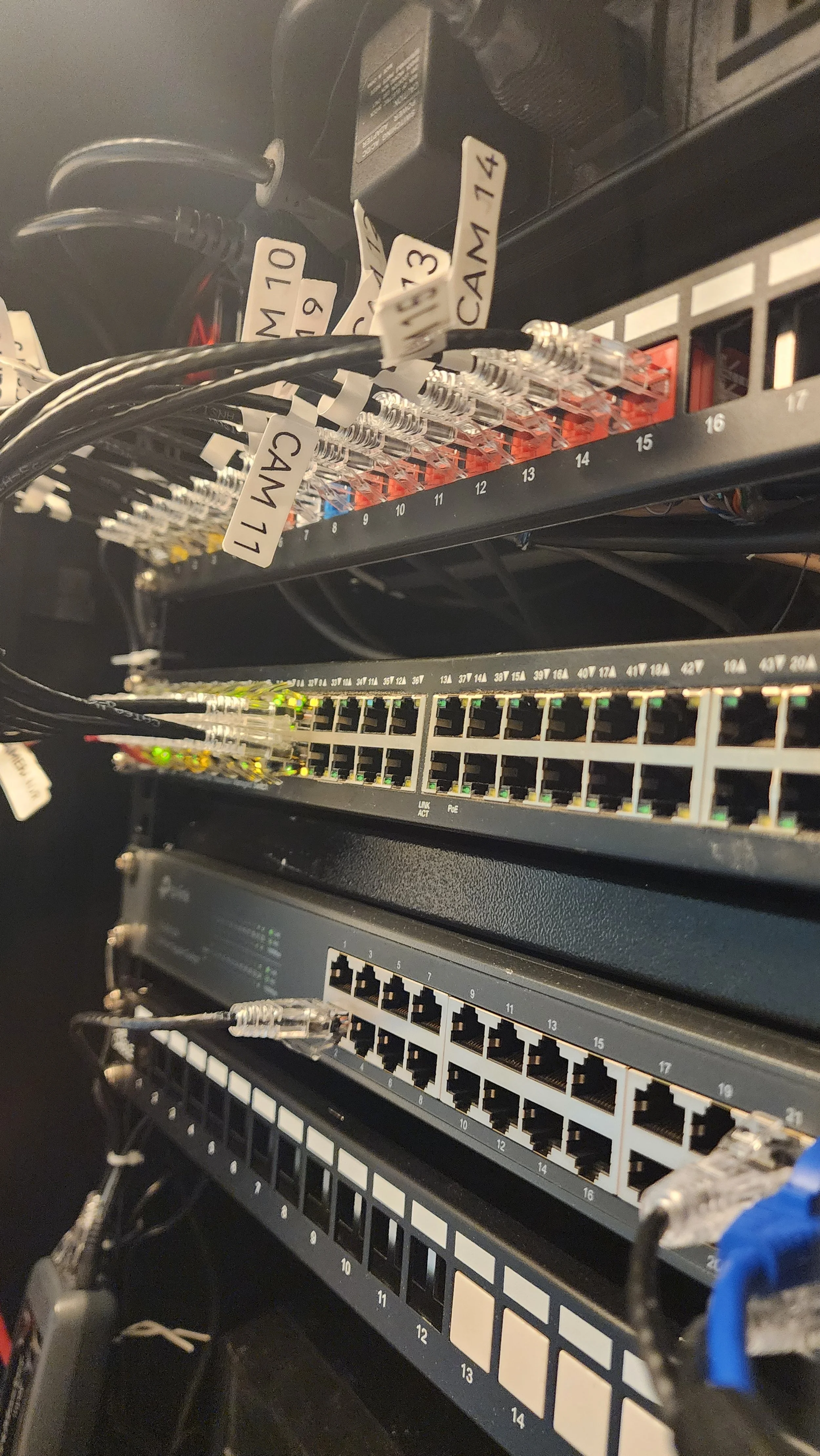Close-up view of a network rack with various interconnected switches and cables labeled with tags such as 'CAM 11' and 'CAM 13'.