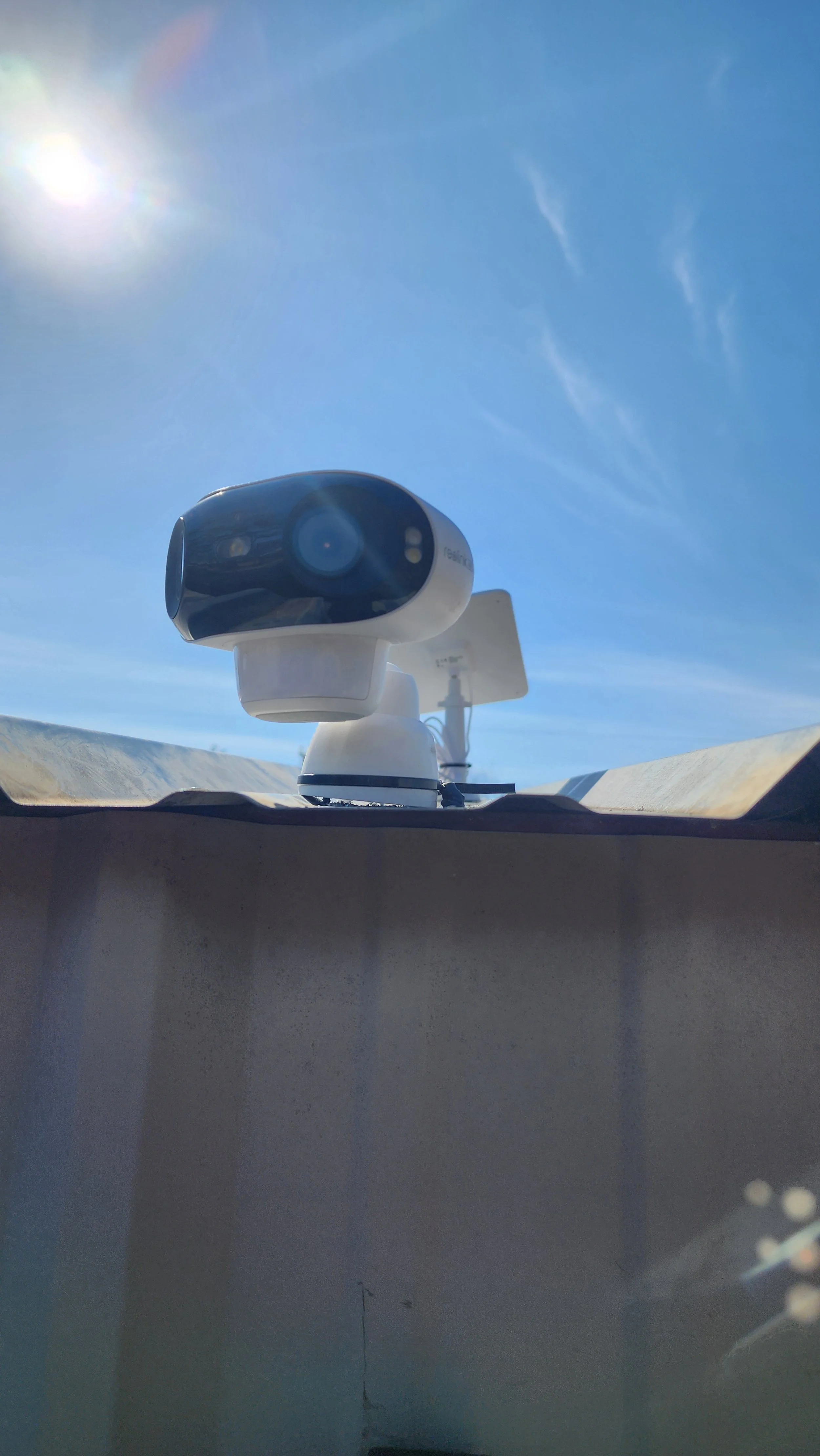 A solar-powered weather camera mounted on a rooftop, with a clear blue sky and the sun shining brightly in the background.